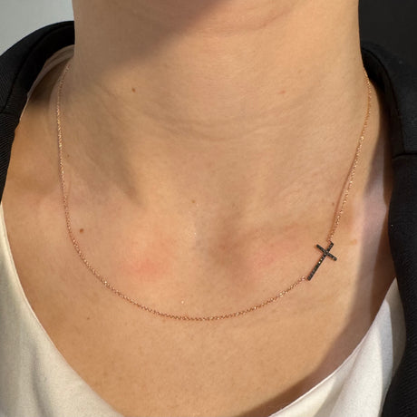Girocollo Croce sul Fianco in Oro Rosa Diamanti Neri