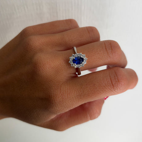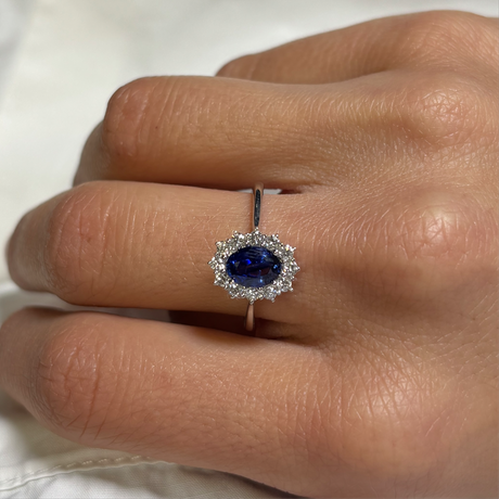 Anello in Oro Bianco con Zaffiro 1.22kt e contorno di Diamanti