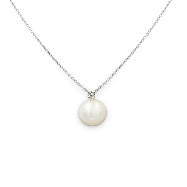 Collana in oro bianco 18 kt con diamante solitario e perla.