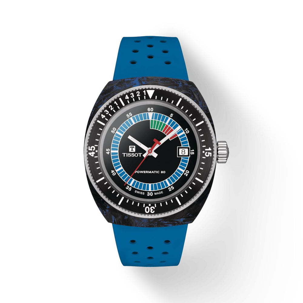L'orologio presenta una cassa in carbonio da 41 mm e un vivace cinturino blu, che rende omaggio alle sue iconiche radici degli anni '70. Il quadrante multicol