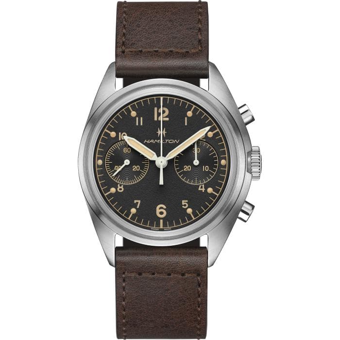 Caratterizzato da uno spiccato design vintage in stile aviazione militare, il Khaki Pilot Pioneer Mechanical Chronograph riporta in auge la forma e la funzionalità dei cronografi della British Royal Air Force anni ’70. Resistente e affidabile, l’orologio da 40 mm è animato dall'esclusivo movimento a carica manuale H-51-Si.