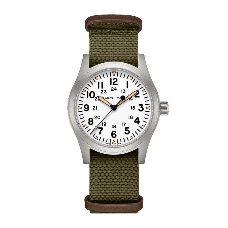 Uno dei segnatempo più iconici di Hamilton è ora disponibile con una cassa più grande. Animato dall’esclusivo movimento a carica manuale H-50, il Khaki Field Mechanical 42 mm conserva la forma originale con una cassa in acciaio con finitura sabbiata e quadrante facilmente leggibile in bianco o nero. Abbinata ad un comodo bracciale in acciaio o ad un cinturino NATO in tessuto verde, questa versione rivisitata di un orologio militare dal design robusto e resistente non ti farà perdere nessuna avventura.
