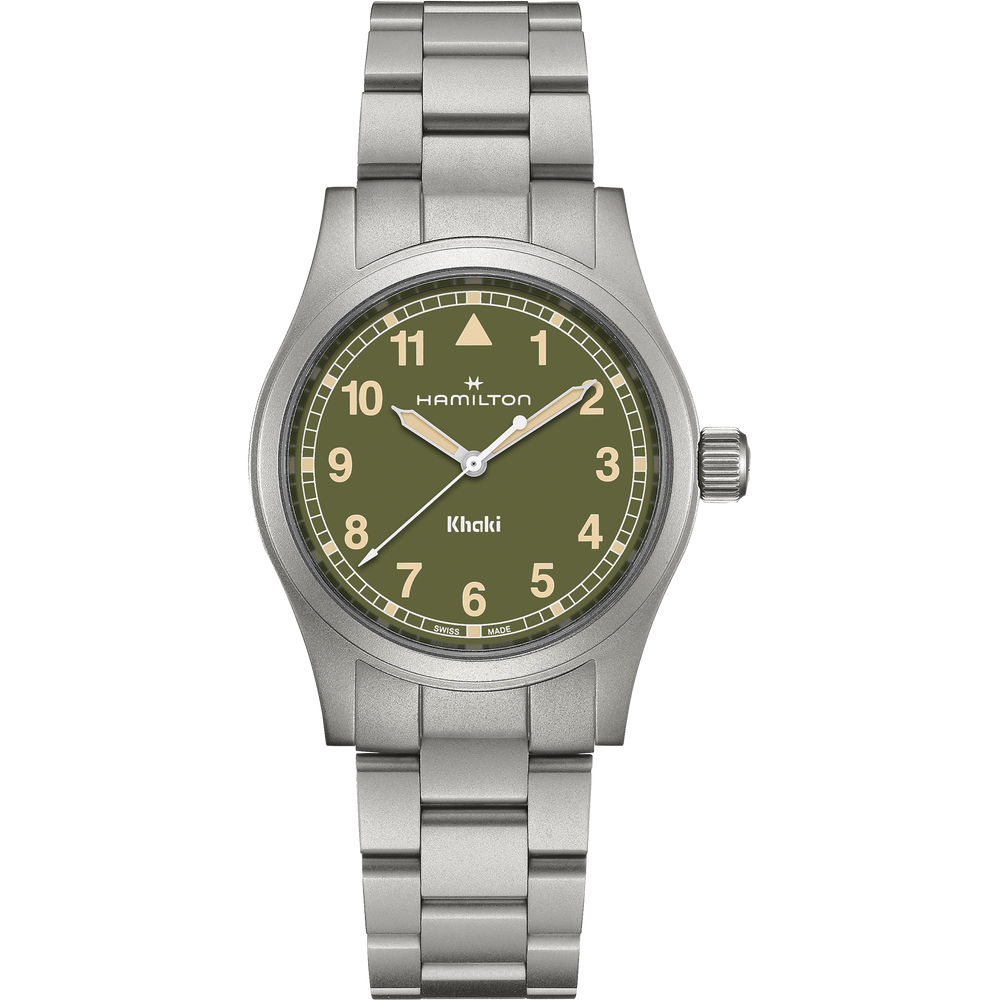 Perfetto per le tue avventure, il Khaki Field Quartz è un compagno affidabile e resistente, pronto per ogni esplorazione. Ispirato alla tradizione di precisione, innovazione e design funzionale di Hamilton, il Khaki Field Quartz combina un quadrante verde da 38 mm con un moderno bracciale in metallo, offrendo uno stile intramontabile.