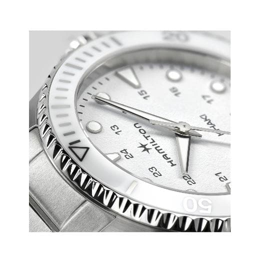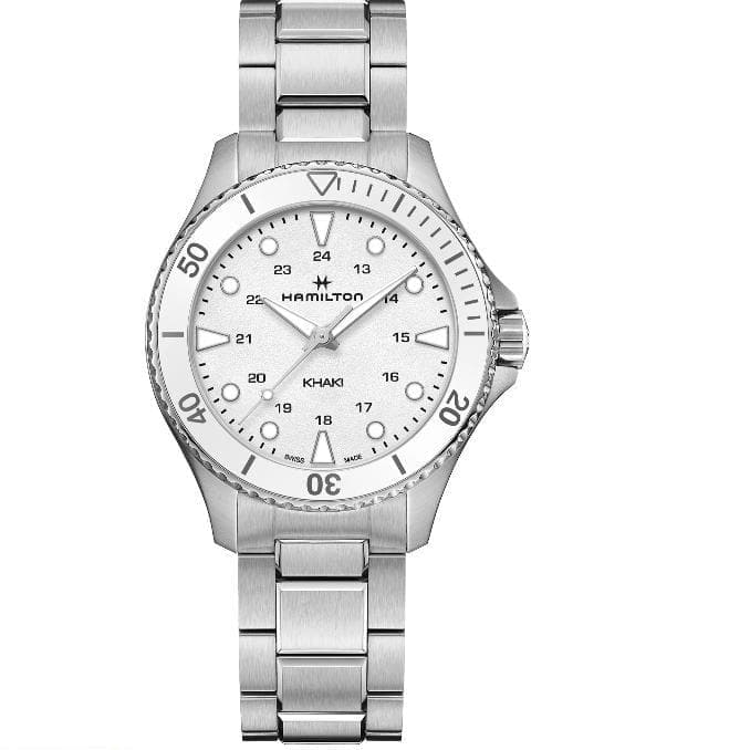 Cogli l’attimo con lo straordinario Khaki Navy Scuba Quartz total white! La lunetta in ceramica da 37 mm con numeri incisi lo rende il segnatempo subacqueo perfetto per gli esploratori marini, proteggendolo da elementi corrosivi come sabbia e sale. Abbinato ad un cinturino in caucciù bianco o ad un elegante bracciale in acciaio, il suo design raffinato ma sportivo assicura puntualità per ogni vacanza al mare o avventura subacquea.