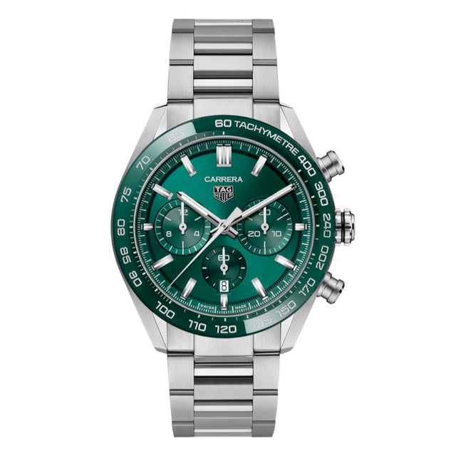 Questo TAG Heuer Carrera elegante e sportivo presenta una cassa da 44 mm in acciaio satinato e lucido, quadrante blu e bracciale in acciaio con maglie a H. Lusso ed eccellenza tecnica in un colpo solo grazie al movimento automatico Heuer 02.