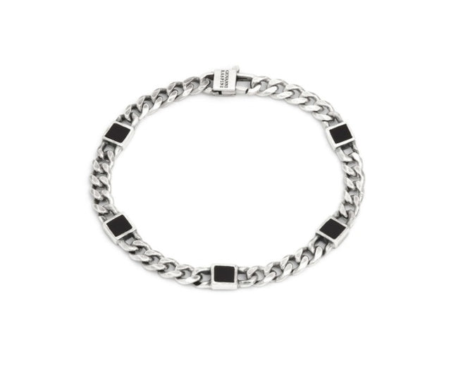 Eleganza contemporanea. Una catena grumetta in argento, intervallata da 5 castoni in argento brunito che portano altrettanti elementi quadrati in resina nera, diventa un iconico bracciale contemporaneo. E' fornito di una innovativa chiusura invisibile. Fatto a mano in azienda. Giovanni Raspini.