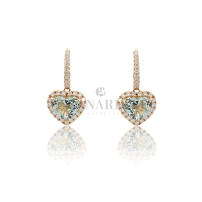 Orecchini quarzo verde taglio cuore in oro rosa 18 kt e diamanti bianchi.