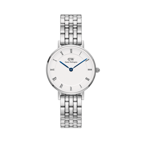 Questa versione del nostro orologio Petite è impreziosita da dettagli di design in stile vintage, come il quadrante con numeri romani e le lancette in acciaio blu, per esprimere il perfetto equilibrio tra un gusto classico e un look di tendenza. Vanta un cinturino in acciaio intercambiabile a cinque maglie color argento.