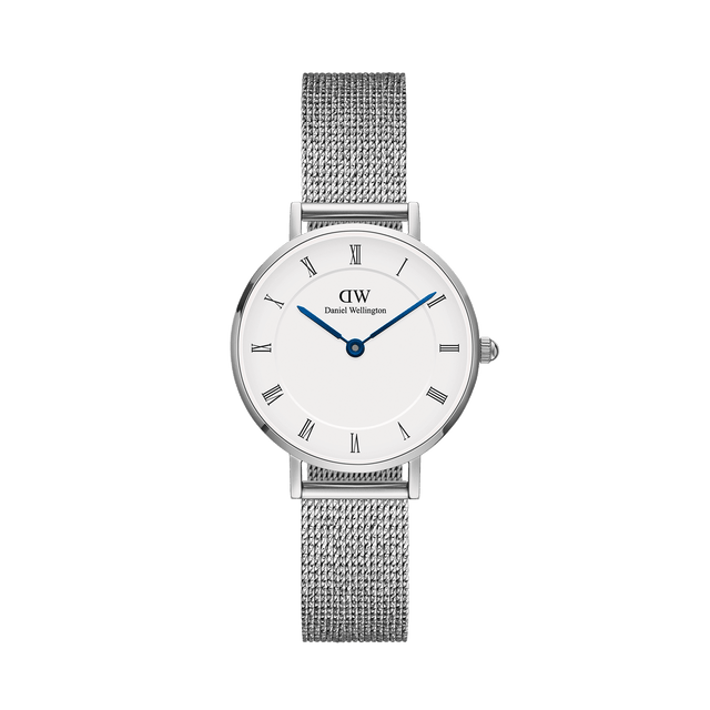Questa versione del nostro orologio Petite è impreziosita da dettagli di design in stile vintage, come il quadrante con numeri romani e le lancette in acciaio blu, per esprimere il perfetto equilibrio tra un gusto classico e un look di tendenza. Vanta un cinturino in maglia milanese intercambiabile color argento.