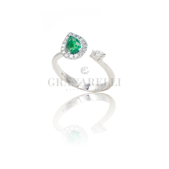 Anello Aperto con Goccia Smeraldo e Diamanti in Oro Bianco