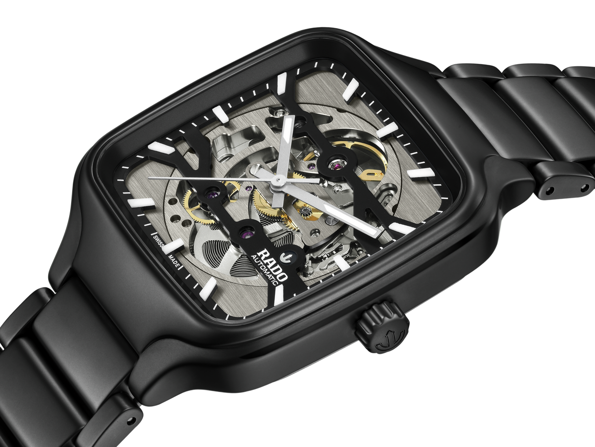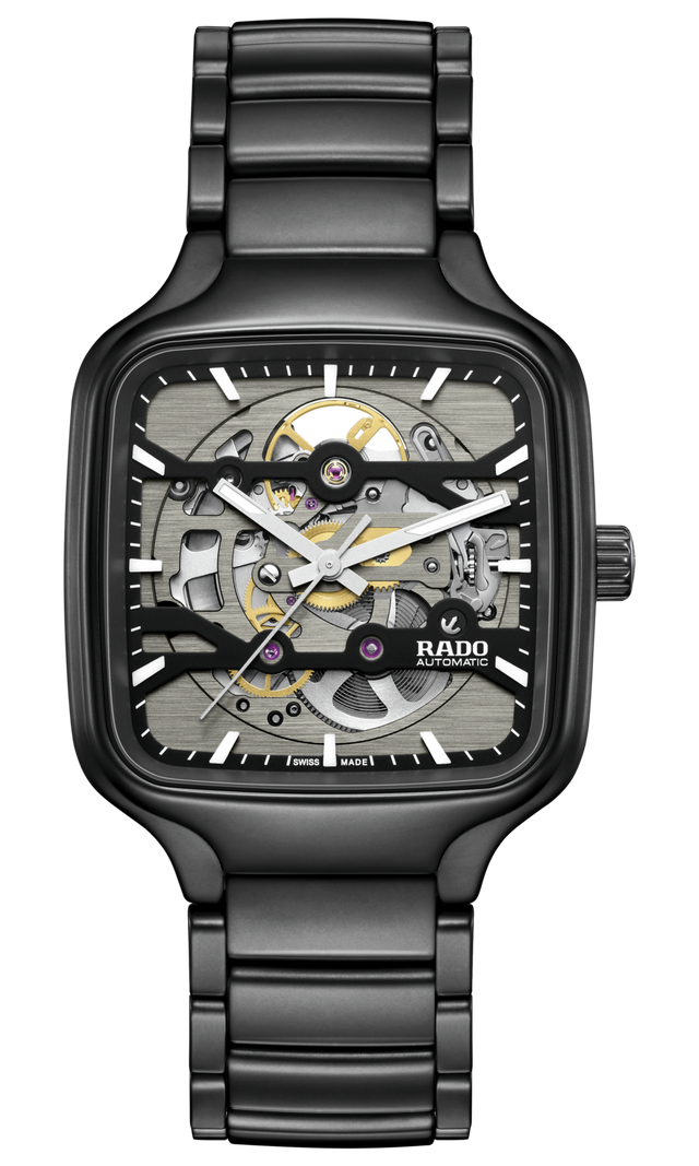 Il True Square è la reinterpretazione di un'iconica forma Rado. Primo orologio del brand realizzato con cassa monoblocco quadrata in ceramica hi-tech a iniezione, il True Square è leggero, antigraffio e confortevole da indossare. Il movimento scheletrato R808 è dotato di 25 rubini e offre una riserva di carica di 80 ore. Rigorosamente testato in cinque posizioni, questo movimento è dotato di una spirale antimagnetica Nivachron™