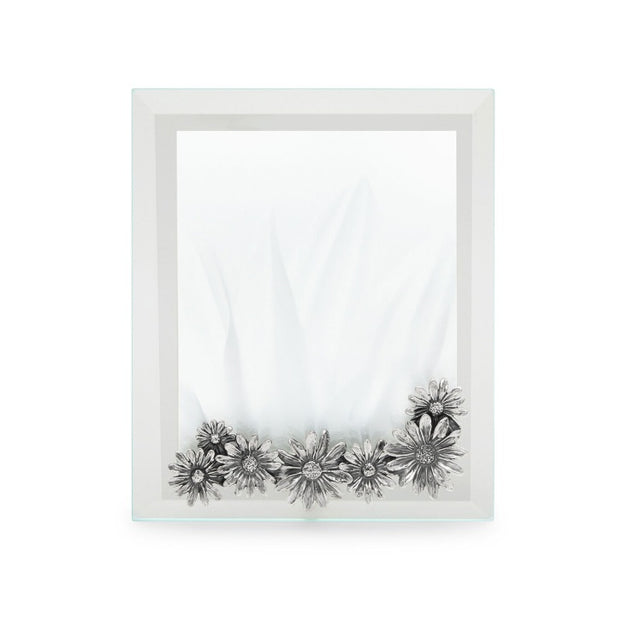 Cornice Giovanni Raspini - Un bellissimo decoro di margherite in argento, fiore evergreen di Giovanni Raspini, rende unica questa cornice caratterizzata dalla grande luminosità dei bordi in vetro molato trasparente. Le margherite, poste con eleganza sul lato inferiore, sono realizzate a mano con l'antica tecnica della fusione a cera persa e successiva brunitura.