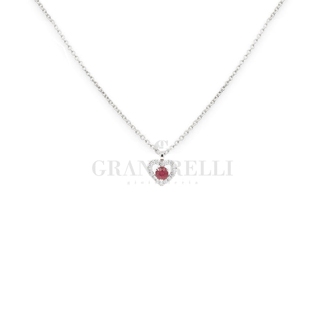 Girocollo con pendente a forma di cuore, Rubino centrale e contorno di Diamanti in oro bianco 18 kt.
