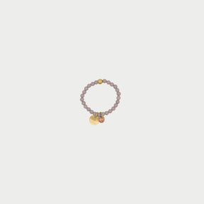 Anello elastico in argento con perline rosa e zirconi milky, impreziosito da ciondoli dorati. Un tocco boho-chic per ogni look.
