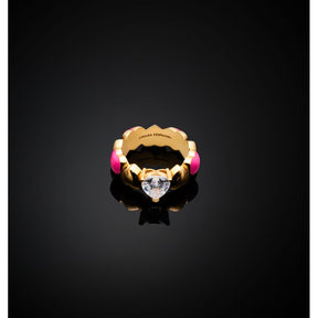 Anello con cuoricini in metallo dorato e zircone centrale bianco dal taglio a cuore. Cuori laterali con smalto "neon" colore rosa.