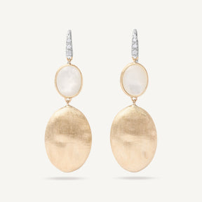 Questo orecchino pendente in oro 18kt è caratterizzato da una madreperla bianca e un’ovalina dalla superficie irregolare, finemente incisa a mano con l'antica tecnica del bulino millerighe. Il gioiello è ulteriormente impreziosito da un amo in pavé di diamanti taglio brillante.