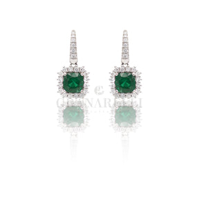 Orecchino modello monachella in oro bianco 18 kt, smeraldo taglio smeraldo e contorno di diamanti.