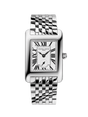 Il Classics Carrée Small Seconds presenta un quadrante argentato con due lancette centrali e una lancetta dei piccoli secondi decentrata sopra la minuteria a settore, oltre a grandi numeri romani e un movimento al quarzo ad alta precisione. Un segnatempo chic ed elegante che evoca gli anni '20, pur offrendo un tocco di modernità.