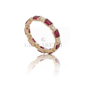 Ring van 18-karaats roségoud, achthoekige robijnen en diamanten.